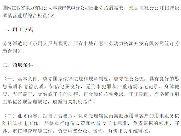 國(guó)網(wǎng)江西省電力有限公司豐城市供電分公司因業(yè)務(wù)拓展需要,現(xiàn)面向社會(huì)公開(kāi)招聘段潭鎮(zhèn)營(yíng)業(yè)廳綜合柜員1名:一、用工形式勞務(wù)派遣制(錄用人員與我司江西省豐城市惠豐勞動(dòng)力資源開(kāi)發(fā)有限公司簽訂勞動(dòng)合同)。二、招聘條件(一)基本條件:遵守國(guó)家法律法規(guī)和規(guī)章制度,遵守社會(huì)公德,...